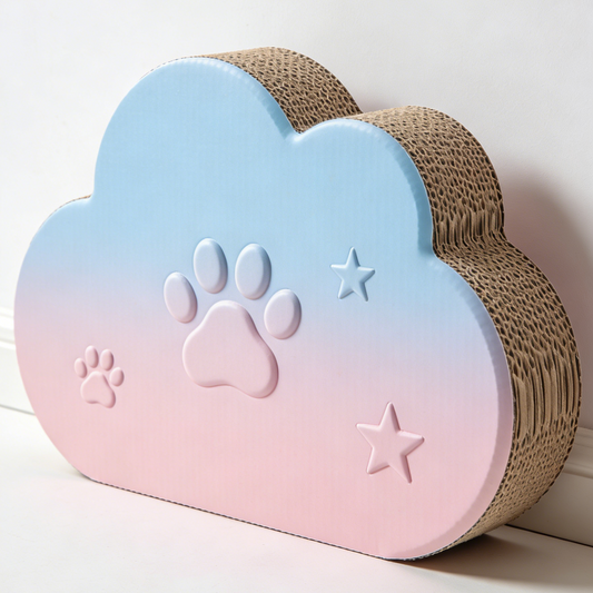 Gradient Cloud Cat Scratcher - Pink & Blue Corrugated Cardboard Scratching Pad with 3D Pa0w & Star Appliqués