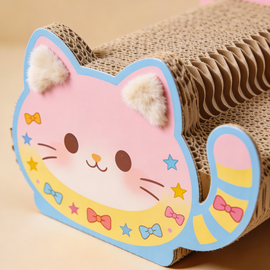 Cartoon Cat Shaped Cat Scratcher - Pink & Blue Corrugated Cardboard Scratching Pad with Pom-Pom Ears